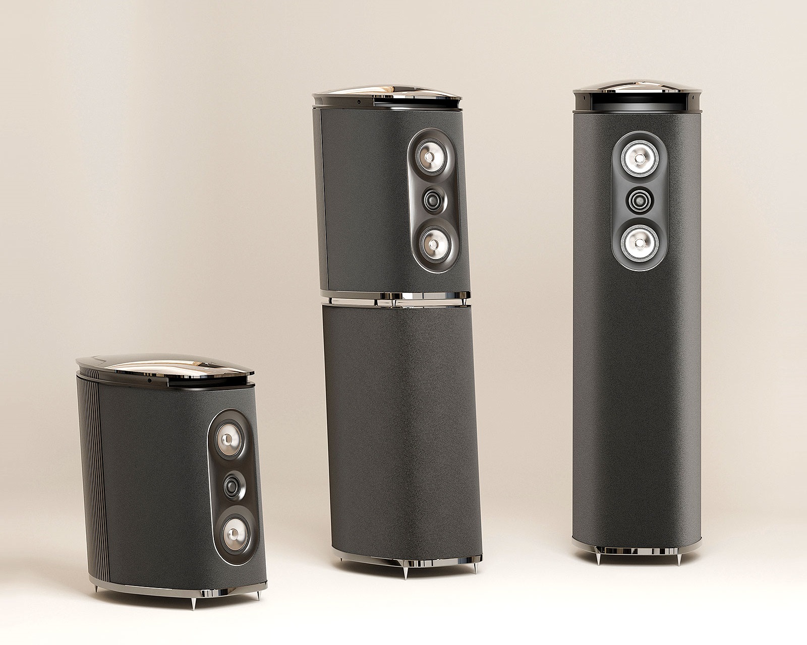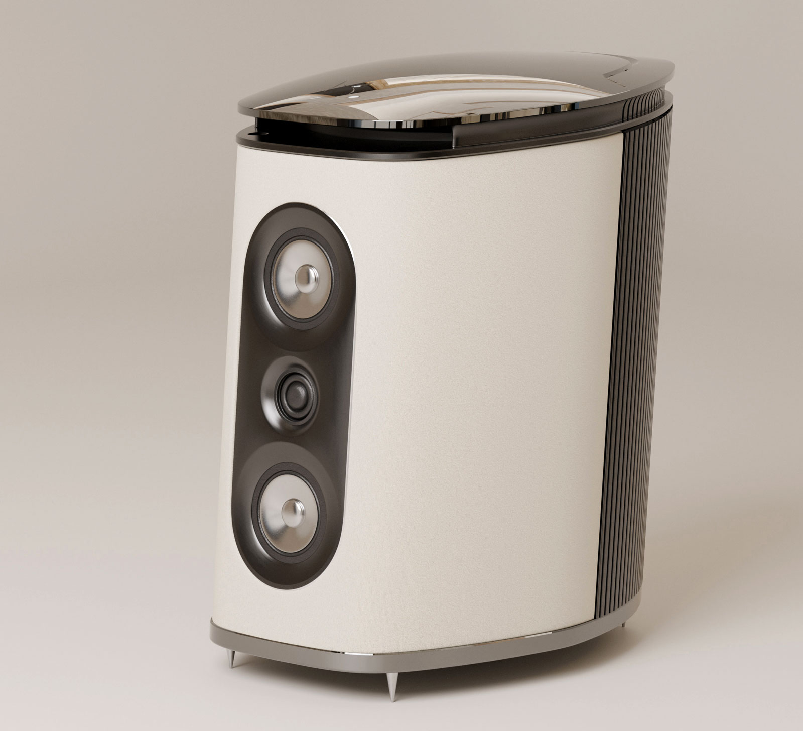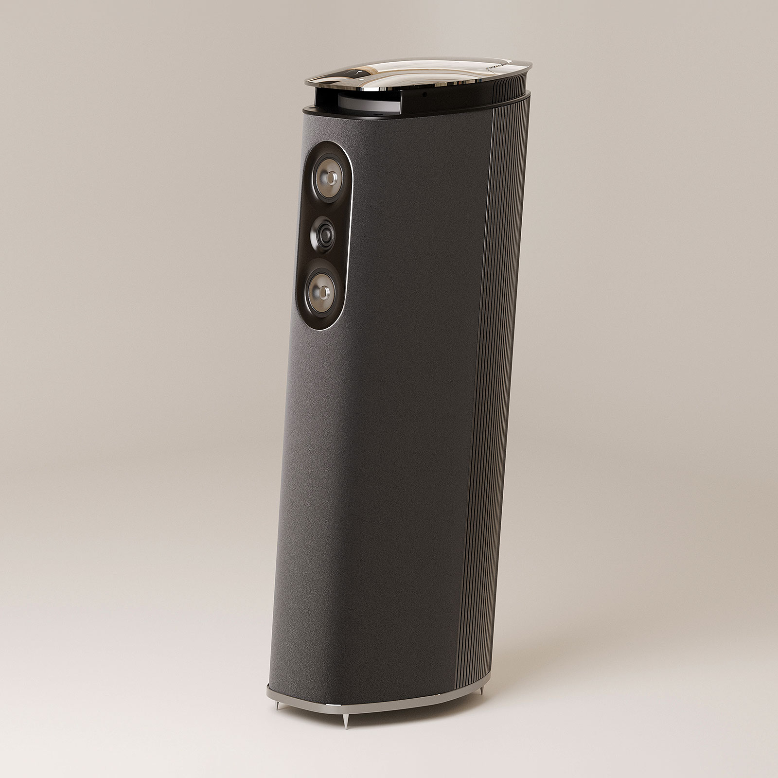 Elk element van de behuizing is ontworpen voor akoestische integriteit. De schijnbaar gebeeldhouwde behuizing elimineert scherpe randen en vlakke oppervlakken die het stereobeeld verstoren, terwijl de nauwe uitlijning van de tweeter en de twee middentoners de coherentie van het geluidsbeeld in zowel horizontale als verticale vlakken behoudt. De ultralichte middentoners zijn ontworpen zonder traditionele spider, voor verbeterde helderheid door mechanische vrijheid.