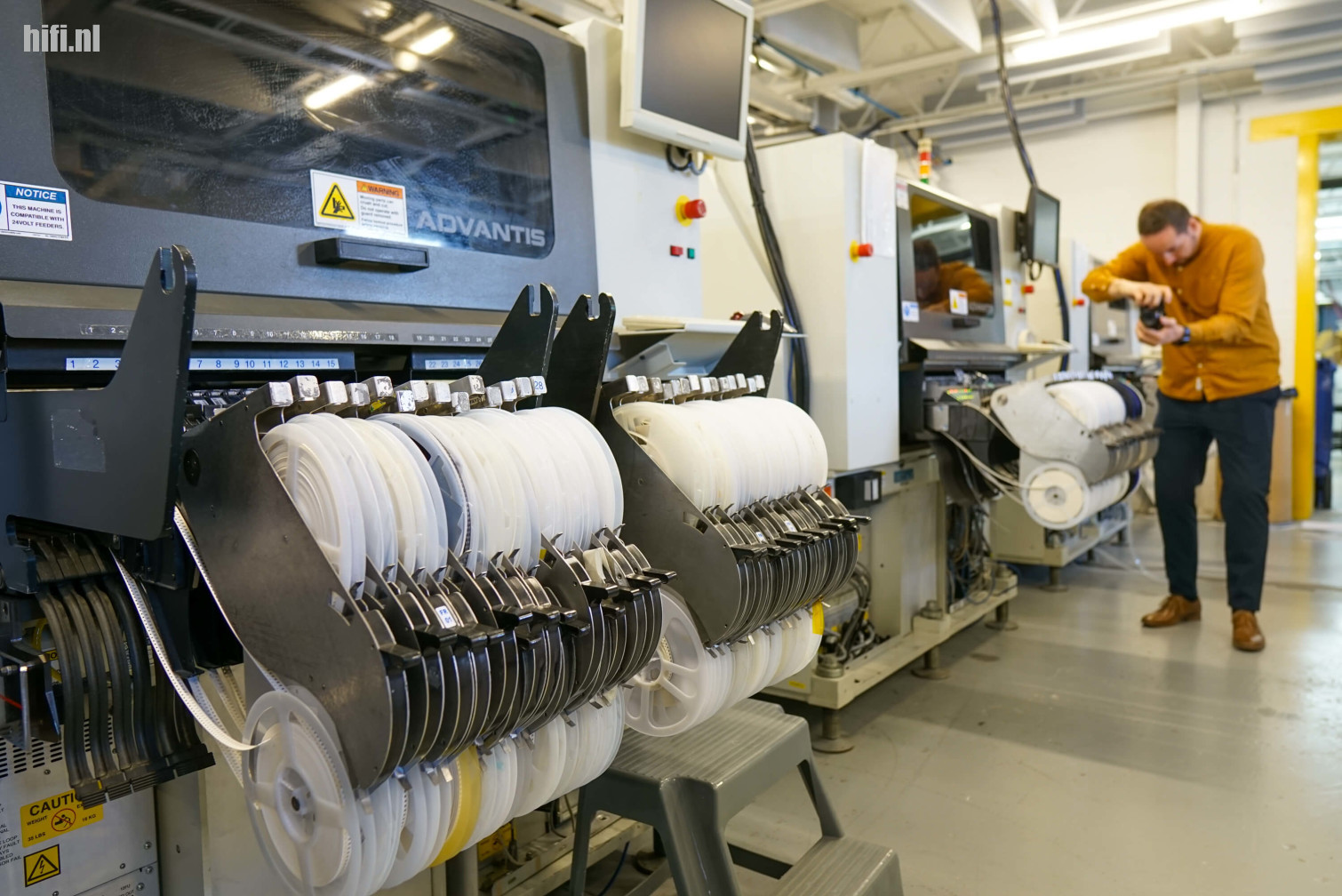 Wat echt indruk maakt als we er rondlopen: MOON doet op vlak van fabricage nagenoeg alles zelf. Van componenten geautomatiseerd plaatsen op eigen PCB’s over het vormen van geperst aluminium tot fraaie behuizingen tot het creëren van de fijnste details met behulp van een reeks geavanceerde CNC-machines. We zijn al vaker bij een audiofabriek binnengelopen, maar het is zelden dat alle stappen écht in-huis gebeuren. De meesten zullen werken met partners uit de buurt om bijvoorbeeld een aluminium voorpaneel piekfijn af te werken of gesoldeerde printplaten ontvangen. Hier gebeurt het in één groot gebouw, waarin een 50-tal werknemers te vinden zijn.