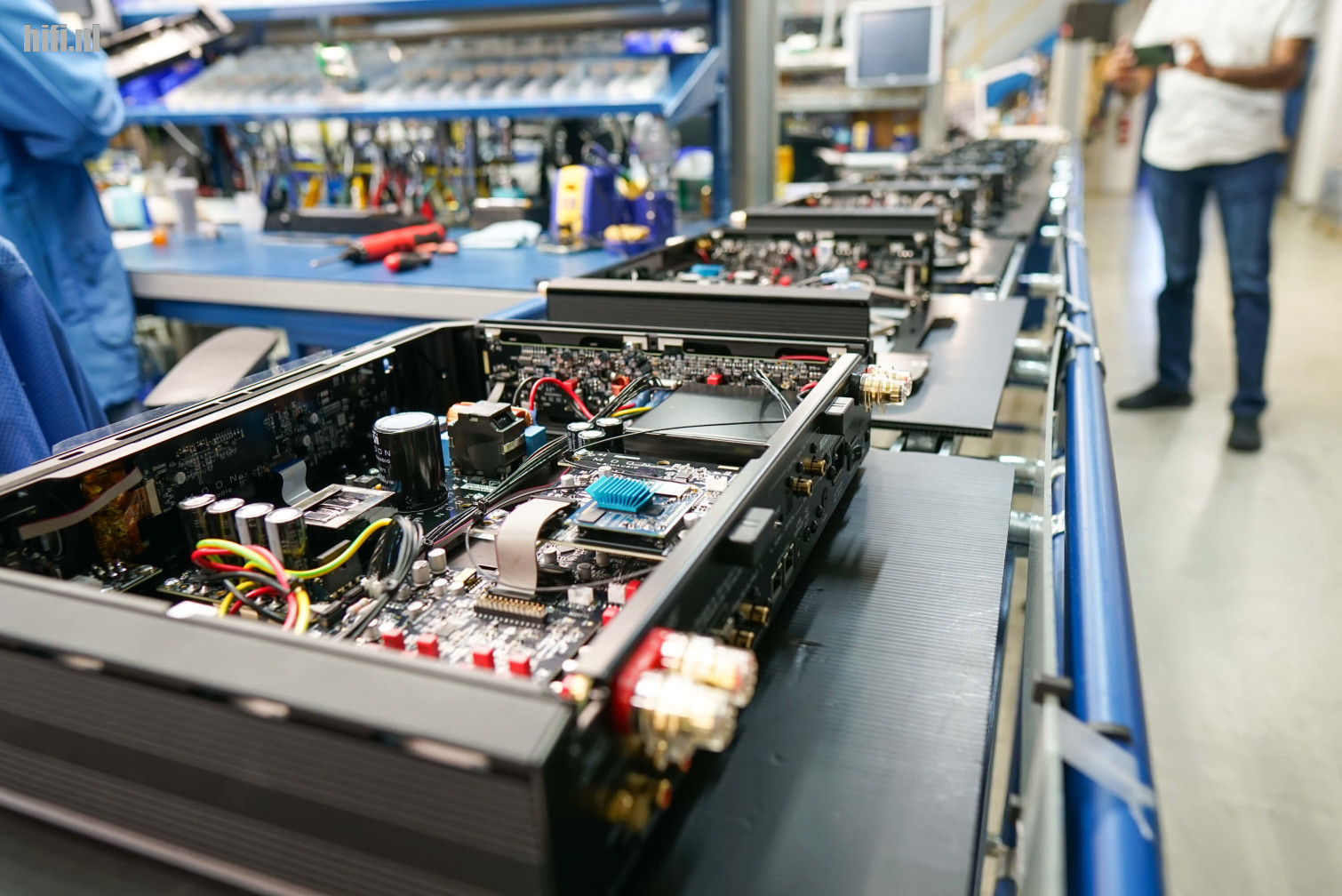 Die zijkant mag er niet uitzien als een klassieke koelvin die je op veel audioapparaten vindt, het bezit wel een gelijkaardige functie. Eigenlijk is die fraaie zijkant een inventief passief koelsysteem voor de eindtrapmodule die aan de binnenkant bevestigd wordt. Op de fabrieksvloer komen we langs toestellen die nog gebouwd worden, waardoor het goed te zien was hoe vernuftig dit in elkaar zit. “Het idee was koeling te bieden zonder een fors uiterlijk [van grote koelvinnen] te krijgen”, legt Dominique uit.