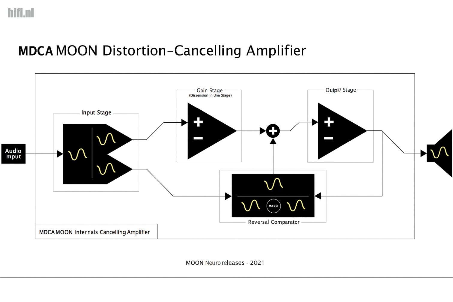 Het MDCA-ontwerp corrigeert volgens de fabrikant vervorming zonder het muzieksignaal zelf aan te tasten. In plaats van gebruikelijke terugkoppelingscircuits vergelijkt MDCA het ingangssignaal met het uitgangssignaal en herstelt enkel de kleine afwijkingen via een correctiecircuit dat geheel buiten de signaalweg is opgenomen. Dankzij deze manier van correctie blijft het oorspronkelijke signaal zuiverder en vrij van nadelige bijwerkingen zoals faseverschuiving, vertraging of instabiliteit die bij traditionele feedback loops wel kunnen optreden. Zie het bij dit artikel geplaatste diagram.