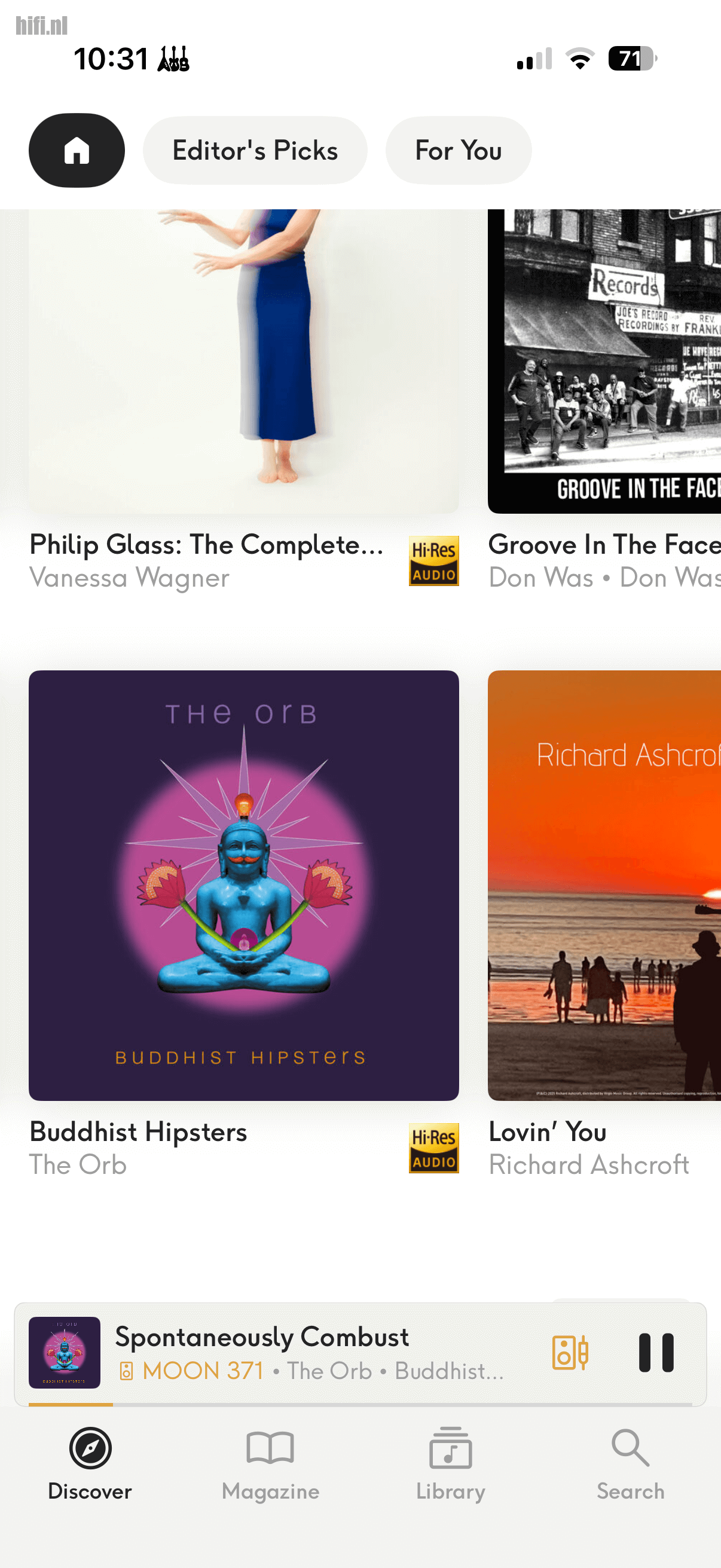 Bij “A Sacred Choice” van het album Buddhist Hipsters van The Orb via streamingdienst Qobuz waan ik me in een gemixt muzikaal landschap van dance en reggae. De diepte, de weidsheid en het ruimtelijke karakter waarmee de ontspannen muzieklijnen en de geluidseffecten de ruimte in worden gestuurd hebben een positief effect op mijn humeur. Wat wordt dit nummer met PRAT weergegeven. Laag heeft een ijzeren controle, een heerlijke punch en is nooit overheersend. Ik kan het niet helpen om het volume een paar streepjes hoger te draaien en me over te geven aan de Caribische vrolijkheid in dit nummer. Door de warmte en de snelheid waarmee deze MOON dit album weergeeft blijft het me met gesloten ogen boeien. En de ogen blijven gesloten omdat er geen sprake is van vermoeiende en misplaatste over-detaillering, maar juist van een hele ontspannen manier waarop ik tot de meest subtiele nuances en de kleinste details geordend verspreid in de ruimte beluister.