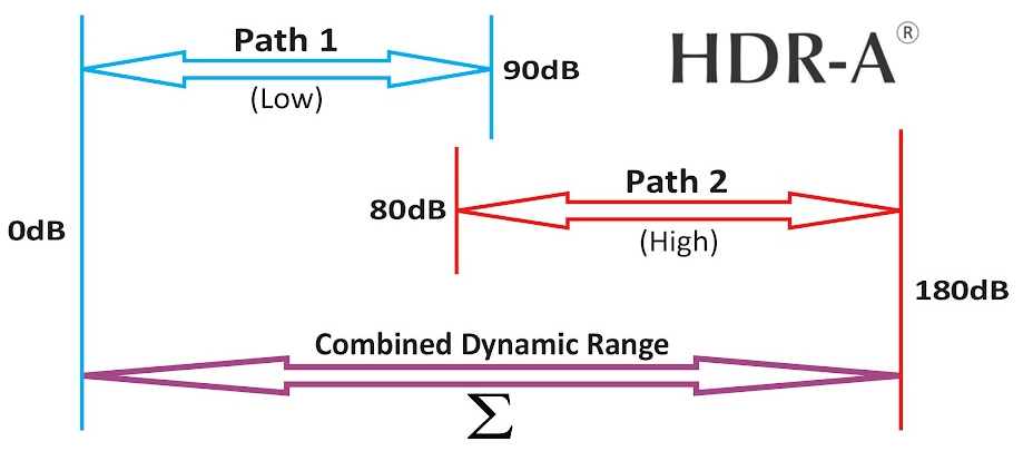 Het perfectioneren van HDR-A vergde meer dan tien jaar continu onderzoek en ontwikkeling. De grafiek laat zien hoe het werkt. Pad 1 is een audiosignaal met een dynamisch bereik van 90 dB, van 0 dB tot 90 dB. Pad 2 is een audiosignaal met een dynamisch bereik van 100 dB, van 80 dB tot 180 dB. Wanneer pad 1 en 2 worden gecombineerd, is het resulterende dynamische bereik 180 dB, van 0 dB tot 180 dB. Dat is multi-pad audio met een hoog dynamisch bereik.