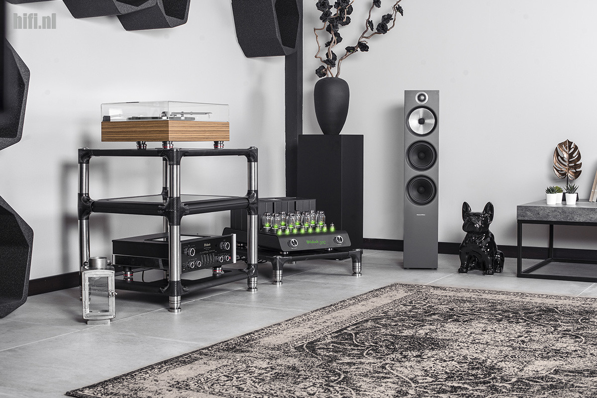 Voor een draaitafel van 100.000 euro heb je dan een investering van 20.000 euro voor zo’n rack. Dat is dan een zogenaamd ‘wide rack’. Een smaller rack is dan weer voordeliger. Dat smalle rack weegt 150kg en de dubbele zo’n 300kg. Voor importeur More Music is het nu handig dat die racks bij Rhapsody staan, waar iedereen kan komen luisteren. Het is namelijk vrijwel ondoenlijk om ze vanwege het gewicht mee te nemen naar shows.