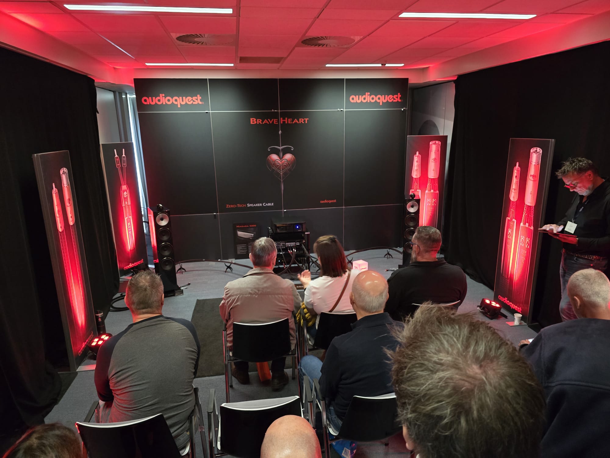 Het Amerikaanse AudioQuest, het merk dat wellicht het beste vertegenwoordigd is op deze en vele andere shows dankzij het aantal merken dat de oplossingen uit Irvine, Californië gebruikt, heeft uiteraard ook weer gewoon een eigen kamer – al komt de bezetting ervan 'gewoon' uit Roosendaal. In de spotlight hier de Brave Heart, de jongste luidsprekerkabel van het merk. De volledige naam luidt AudioQuest Brave Heart Zero-Tech, een luidsprekerkabel die ‘grootser, stiller en in alle opzichten beter’ is dan alle andere luidsprekerkabels die de fabrikant eerder voor deze prijs in de markt wist te zetten. Het formaat van de Brave Heart is dan ook bijna gelijk aan de Mythical luidsprekerkabels van het merk (lees: slechts 0,6 millimeter kleiner).