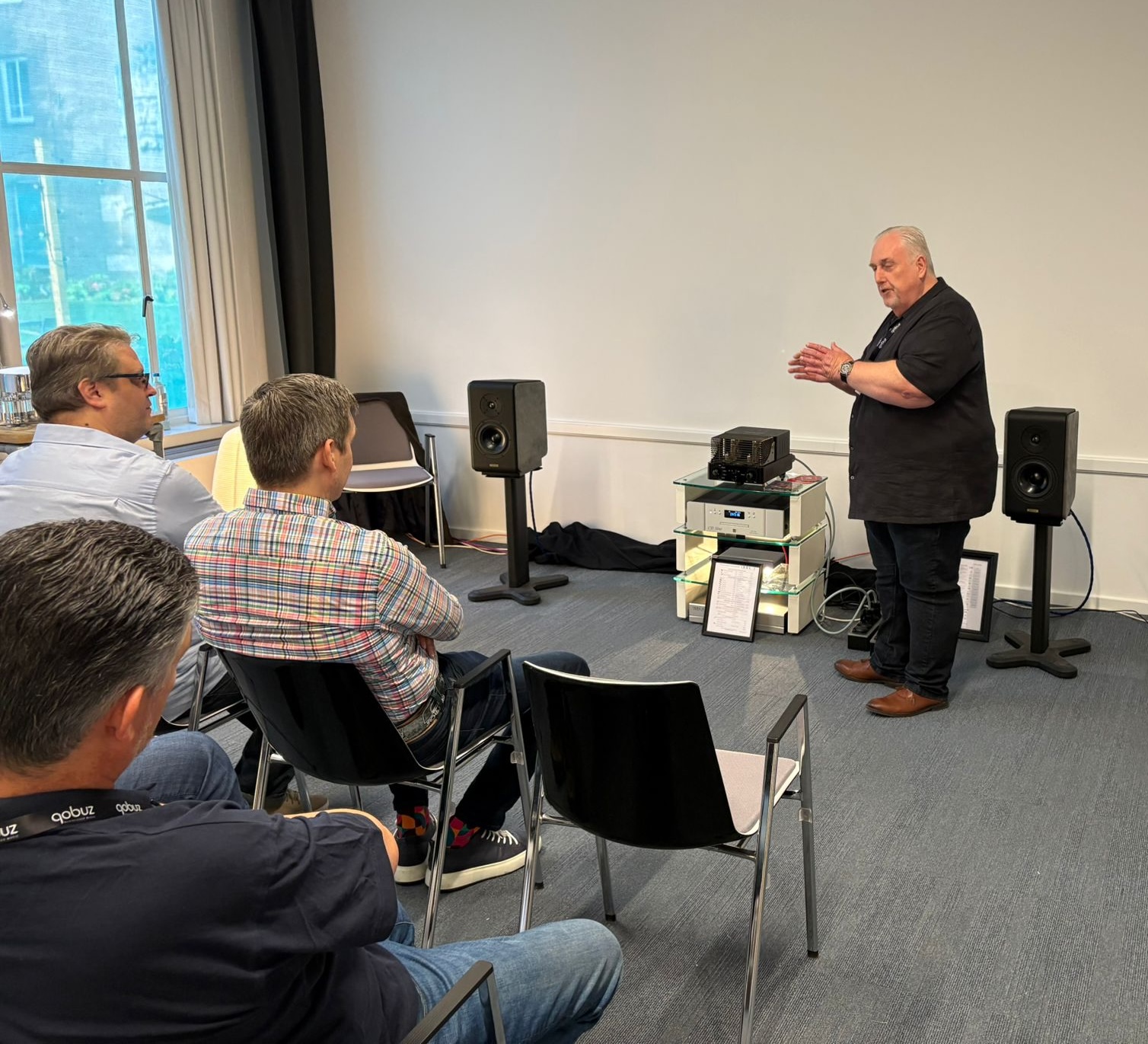 We starten de tweede dag van 'DAE2025' door net als op de zaterdag van de show een klein beetje vals te spelen. Vóór de aanvang van de zondag om 10u gingen we namelijk al bij Reference Sounds langs. Om precies te zijn: dat deden we zaterdagavond ná de show, en in het bijzijn van niemand minder dan de Amerikaanse gasten van Michael Huigen, te weten Peter McGrath (director of sales cq brand ambassador Wilson Audio) en Bill McKiegan (Dan D'Agostino president, hier rechts op de foto), die ons meenamen in wat objectief en subjectief gezien toch wel de set van de show moet zijn.