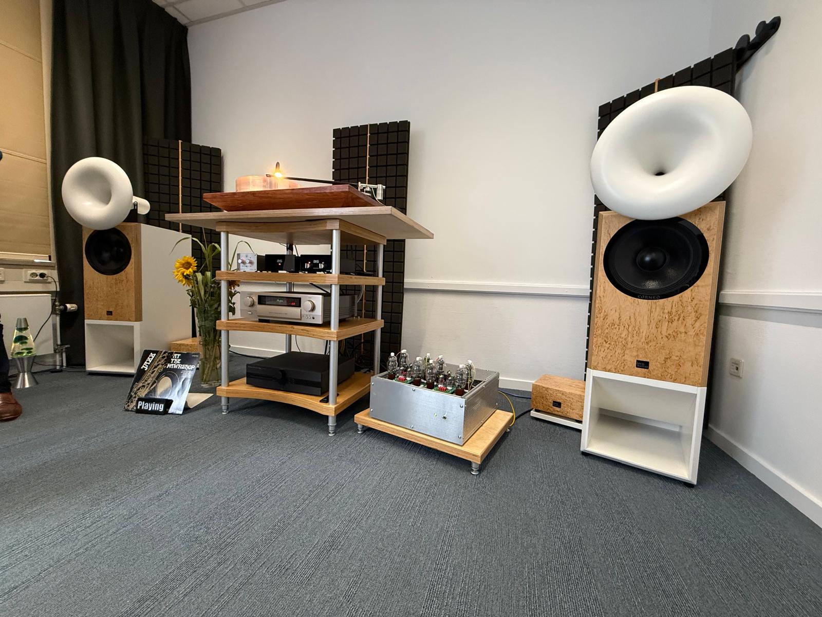 De STUdo-Hifi Horn-Kultur Corneo (foto rechtsboven) is een compromisloze 2-weg hoornluidspreker, met een 12-inch gecoate papieren woofer en een indrukwekkende tractrix hoorn van 440 mm. Deze is speciaal ontworpen voor een ongekend natuurlijk, snel en dynamisch geluidsbeeld. De hoorn opent tot 120°, wat zorgt voor een breed klankbeeld en een royale ‘sweet spot’.
