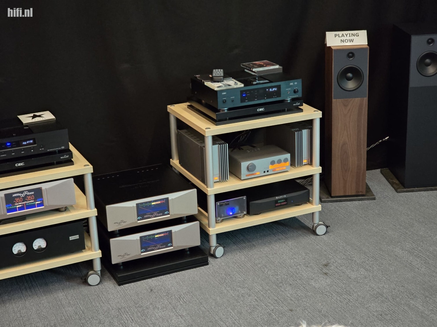 Maximale prestaties en technische verfijning: centraal staan de Guru 42 luidsprekers, momenteel nog prototypes, samen met high-end elektronica uit het Merrill Audio programma. Als bron de referentie C.E.C. CD2N cd-speler, een apparaat dat zich onderscheidt door zijn verfijnde loopwerk en uitstekende digitale signaalverwerking. De signaalketen wordt vervolgd met de Merrill Audio RoseQX voorversterker, een meesterwerk dat dankzij zijn transparantie, lage ruis en muzikale finesse de subtielste details blootlegt zonder hardheid. Aangesloten zijn twee Merrill Audio Element 110 mono eindversterkers, die met hun verfijnde single-ended versterking zorgen voor een uitzonderlijk vloeiende en natuurlijke klank, zelfs bij complexe passages.
