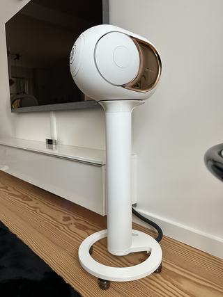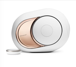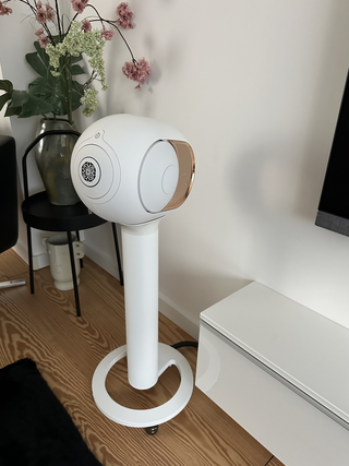 Complete high-end set van 2x Devialet Phantom I 108db gold, Iconic White met 2x originele TREE stands (iconic white) voorzien van IsoAcoustic Gaia III voetjes voor een betere ontkoppeling en geluidskwaliteit.