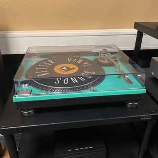 De gehele bovenplaat is vervangen door deze duidelijke groen/blauw gekleurde variant die de platenspeler een uniek karakter geeft.