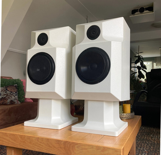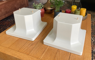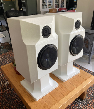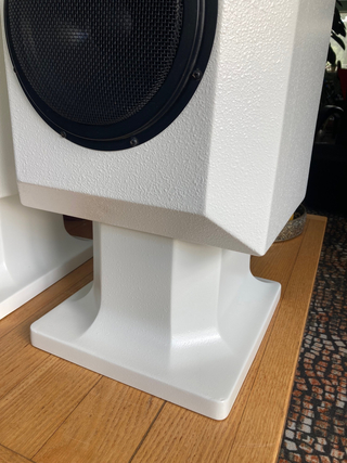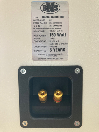 In het ontwerp zijn twee (niet geluid beïnvloedende) wijzigingen aangebracht en dat betreft de stands en de aansluit terminals. In de stands zijn pennen aangebracht die passen in gaten in de onderkant van de speakers. Dat garandeert een stabiele opstelling. Zie de laatste foto.