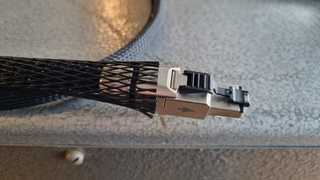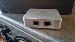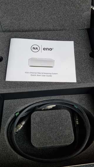 Zeer goed ethernet filter Eno2 van Network Acoustics met twee bijbehorende LAN kabels.