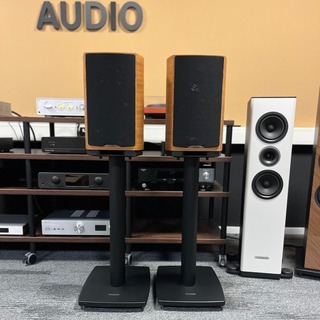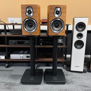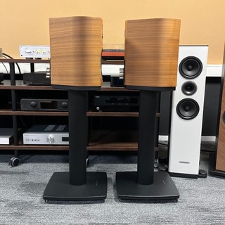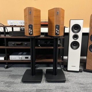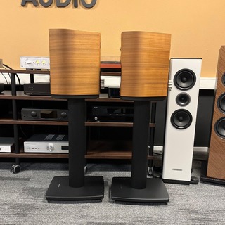Het gaat hier om een set monitor speakers uit de Sonetto II generatie 1 serie in de kleur walnut met zwarte stands.