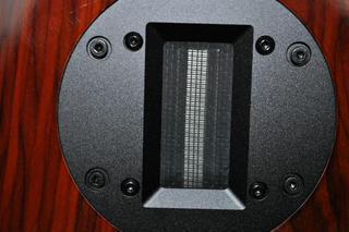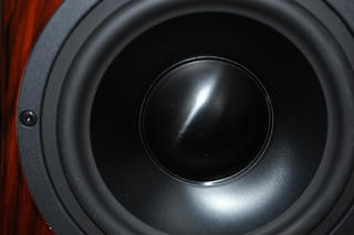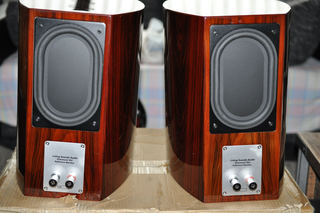 The front baffle is 8? wide, but the enclosure measures 9.5? at its widest point. The driver complement comprises a ribbon tweeter and a 6.5? high-excursion metal-cone midrange woofer supplemented by a rear-mounted 5?W × 7?H passive radiator. The midrange woofer features an XBL2 motor, which is said to provide consistent flux density through a long voice coil gap, resulting in reduced distortion. The driver is designed and manufactured exclusively for LSA.