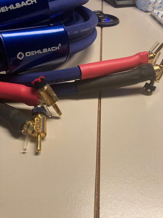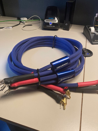 Wegens een wijziging in mijn set, andere Luidspeakers, nu te koop een set Oelhbach Airtube luidspeaker kabels van 2 meter lang, afgemonteerd met WBT Spade (aan de luidspeaker kant) en WBT klem banaanstekers aan de versterker kant.
