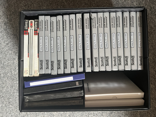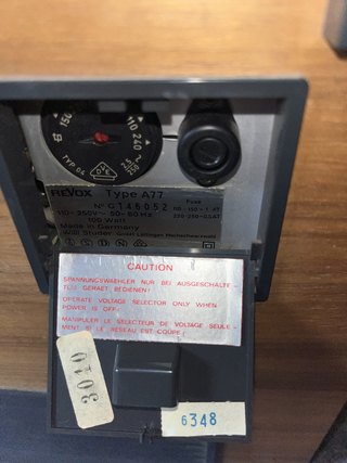 Beschrijving4-sporen A77 MkIII met losse metalen reels, 20 tal lege tapes en een onderhoudsset. |