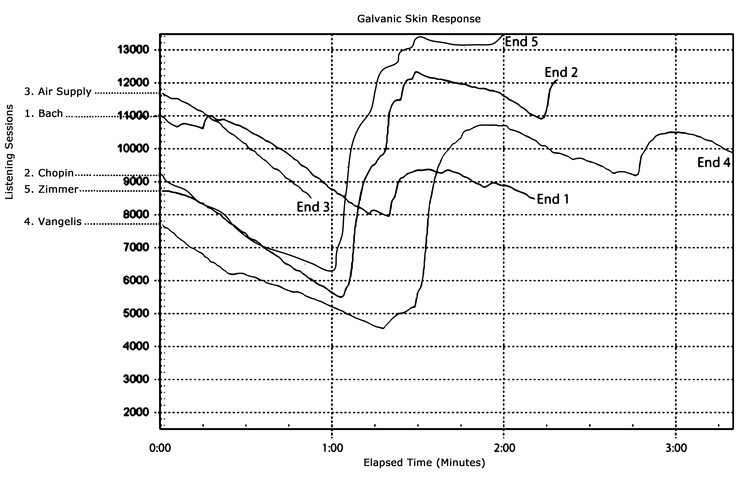 In de grafiek hiernaast vind je de luisterresultaten van één persoon uit de test. De pieken, die opwinding aantonen, vallen precies samen met een plotselinge verandering in de muziek – en het krijgen van kippenvel. De conclusie van het onderzoek is dat personen die helemaal op kunnen gaan in de muziek en écht actief luisteren een grotere kans hebben op kippenvel. Als je passief luistert of muziek vooral gebruikt als achtergrondgeluid zou het zomaar kunnen dat je het nooit zal ervaren.