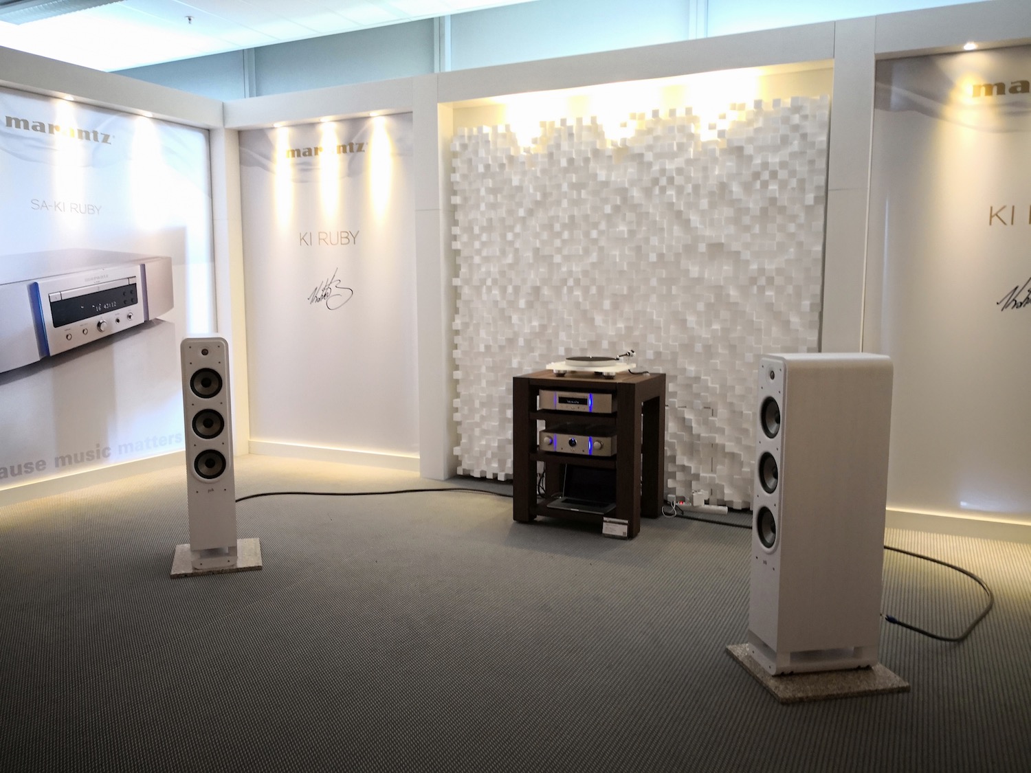 De PM-KI Ruby eindversterker (2x 100Watt aan 8 ohm, 2x 200Watt aan 4 ohm) heeft HDAM SA3 aan boord (de welbekende High Definition Amplifier Module van de Japanners) en is voorzien van een MM/MC-phono ingang met Marantz Musical Premium Phono EQ. Op de stand van Marantz wordt de nagelnieuwe KI Ruby-set gedemonstreerd op een paar speakers van Polk Audio, dat we sinds vorig jaar ook in de stal van Sound United vinden. Een set die overkomt als een soort baby-PM10 en SA10, met inderdaad ook enkele eigenschappen overgenomen - zoals de DAC.