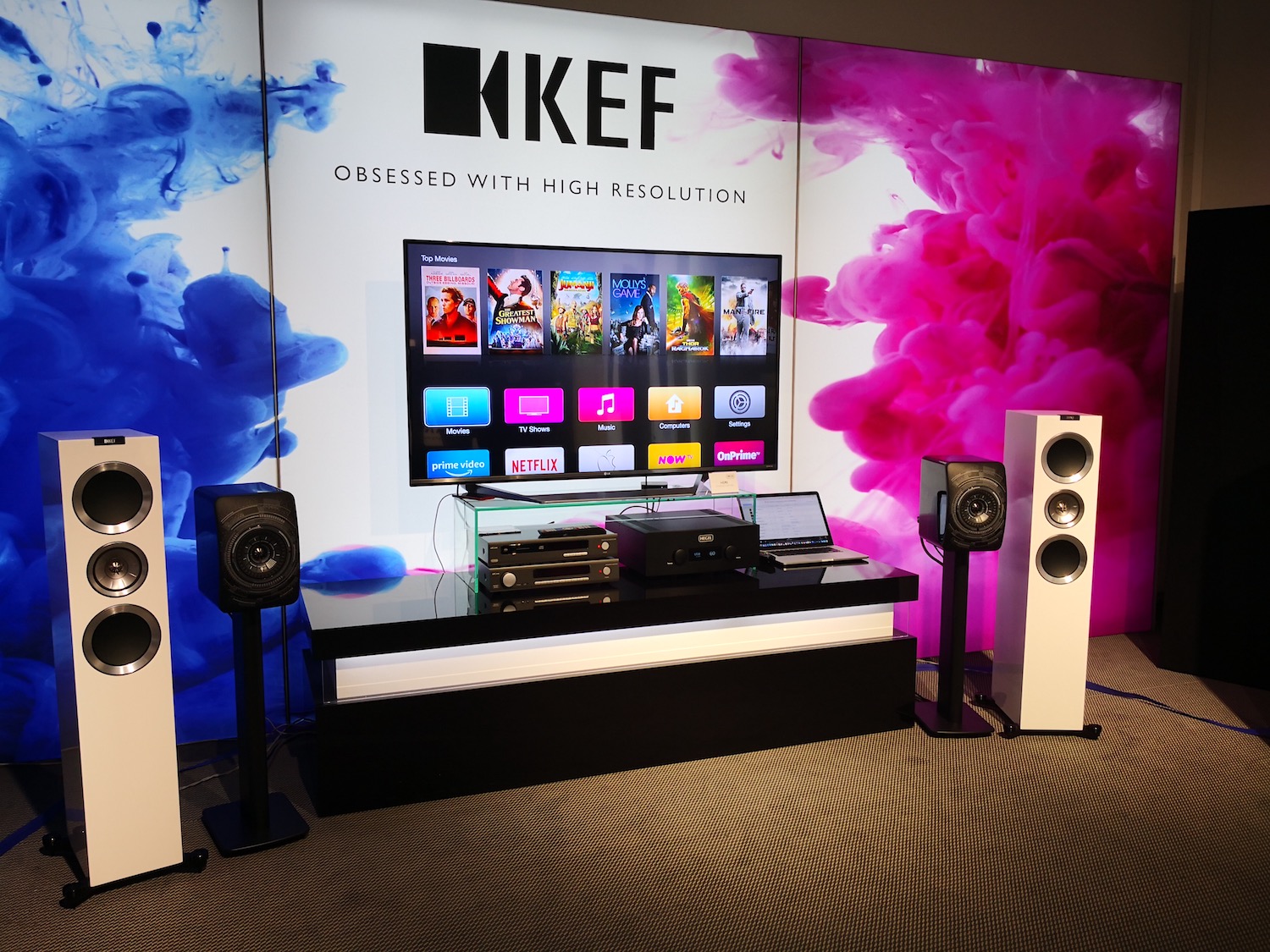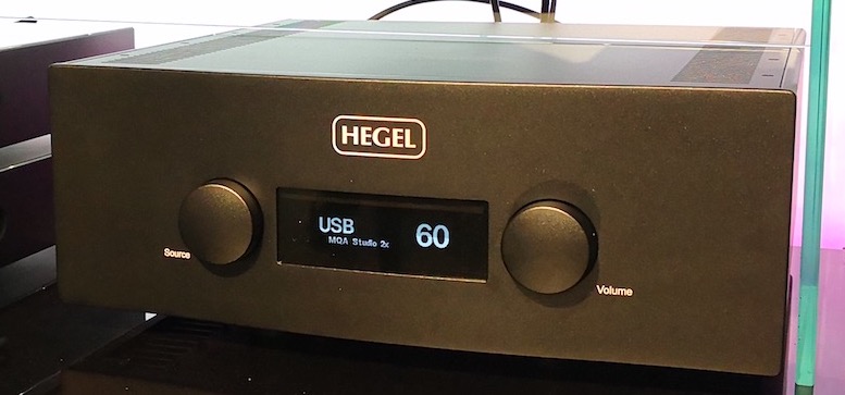 Hegel demonstreert die zware eindversterker met MQA-ondersteuning op een set KEF-speakers.