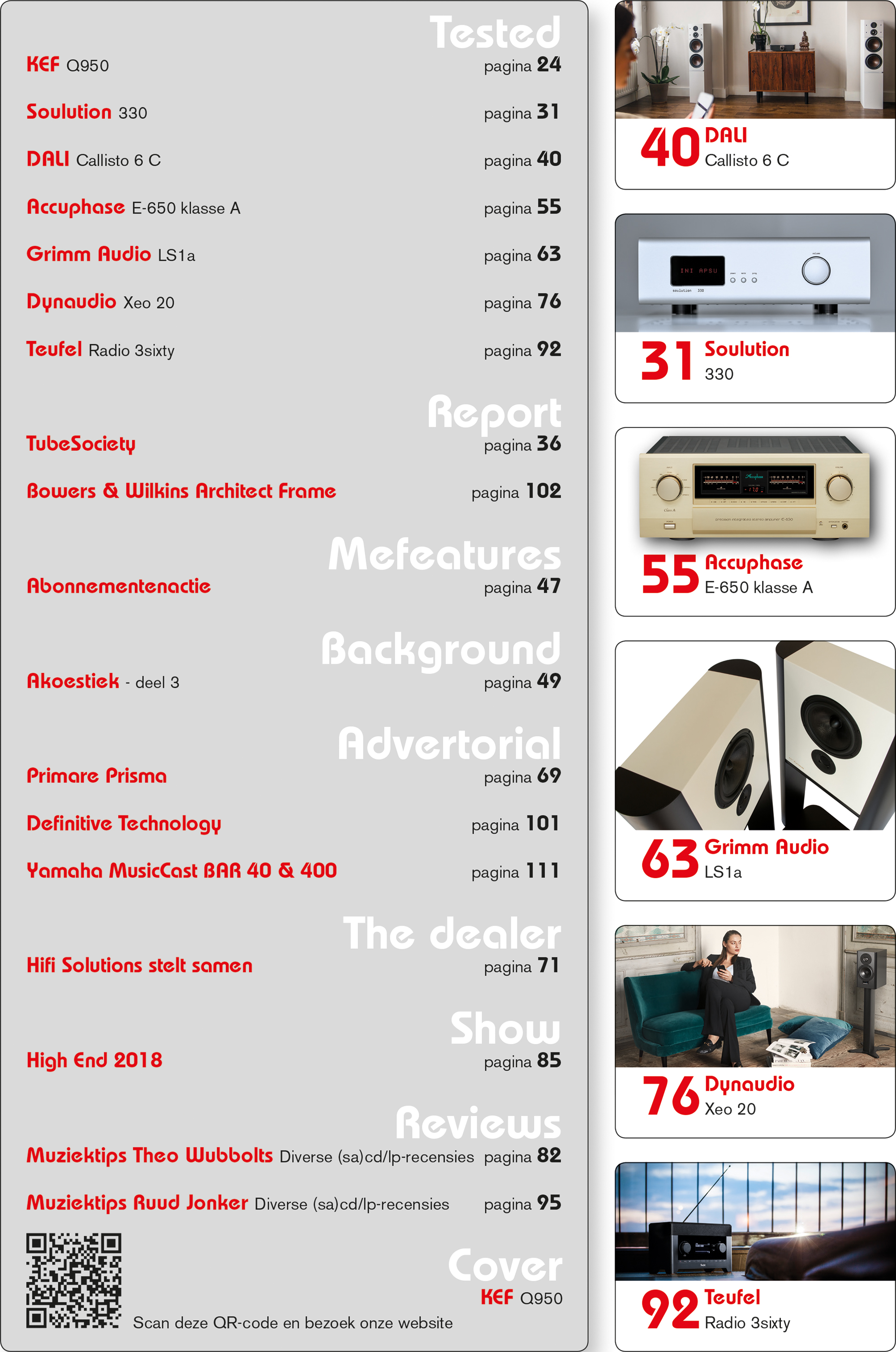 In deze editie lees je uitgebreide tests van KEF Q950, Soulution 330, DALI Callisto 6 C, Accuphase E-650 klasse A, Grimm Audio LS1a, Dynaudio Xeo 20 én Teufel Radio 3sixty. Harro Tillema bracht daarnaast een bezoek aan Hifi Solutions in Amsterdam en er is een reportage over TubeSociety: de zelfbouwkant van High-End.